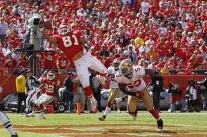 KANSAS CITY, MO – SEPTEMBER 26: Tony Moeaki #81 of the Kansas City Chiefs makes a one-handed 18-yard touchdown catch behind NaVorro Bowman #53 of the San Francisco 49ers at Arrowhead Stadium on September 26, 2010 in Kansas City, Missouri. The Chiefs won 31-10. (Photo by Joe Robbins/Getty Images)