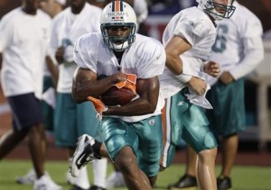 Daniel Thomas 0 By KMAN Staff on August 22, 2011 Miami Dolphins running back Daniel Thomas carries the ball after he received a handoff during NFL football training camp in Miami, Monday, Aug. 1, 2011. (AP Photo/J Pat Carter)