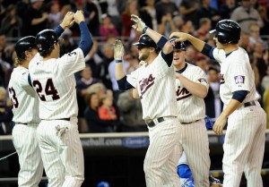 MINNEAPOLIS, MN – SEPTEMBER 27: (L-R) Joe Benson #63, Trevor Plouffe #24, Rene Tosoni #23, Chris Parmelee #64 and Danny Valencia #19 of the Minnesota Twins celebrate a grand slam by Rene Tosoni in the sixth inning against the Kansas City Royals on September 27, 2011 at Target Field in Minneapolis, Minnesota. (Photo by Hannah Foslien/Getty Images) *** Local Caption *** Joe Benson;Trevor Plouffe;Rene Tosoni;Chris Parmelee;Danny Valencia