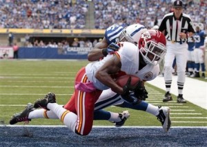Kansas City Chiefs wide receiver Steve Breaston scores the go-ahead touchdown as he’s hit by Indianapolis Colts defensive back Chris Rucker in the fourth quarter of an NFL football game in Indianapolis, Sunday, Oct. 9, 2011. The Chiefs defeated the Colts 28-24. (AP Photo/AJ Mast)