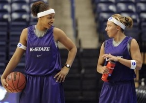 Kansas State’s Jalana Childs, left, and Brittany Chambers, right, talk to one another during practice in the first round of the NCAA women’s college basketball tournament Storrs, Conn., Saturday, March 19, 2011. Kansas State plays Purdue on Sunday. (AP Photo/Jessica Hill)