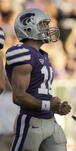 Kansas State kicker Anthony Cantele celebrates after kicking a 31-yard field goal to give Kansas State the lead during the fourth quarter of an NCAA college football game against Baylor on Saturday, Oct. 1, 2011, in Manhattan, Kan. Kansas State won 36-35. (AP Photo/Charlie Riedel)