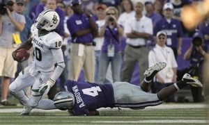 Robert Griffin III 0 By KMAN Staff on October 3, 2011 Baylor quarterback Robert Griffin III (10) is tackled by Kansas State linebacker Arthur Brown (4) during the fourth quarter of an NCAA college football game Saturday, Oct. 1, 2011, in Manhattan, Kan. Kansas State won 36-35. (AP Photo/Charlie Riedel)
