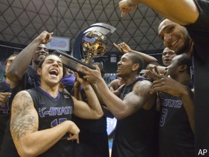 Members of the Kansas State basketball team hold up their Diamond Head Classic championship trophy after an NCAA college basketball game Sunday, Dec. 25, 2011, in Honolulu. Kansas State defeated Long Beach 77-60 to win the 2011 Diamond Head Classic. (AP Photo/Eugene Tanner)