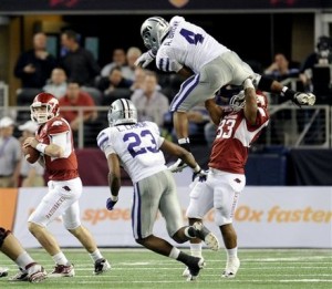 Kansas State linebacker Arthur Brown (4) is upended by Arkansas running back Dennis Johnson (33) as he goes after quarterback Tyler Wilson (8) during second half of the Cotton Bowl NCAA college football game, Friday Jan. 6, 2012 in Arlington, Texas. Arkansas won 29-16. (AP Photo/Matt Strasen)