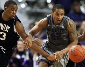 Howard guard Prince Okoroh (3) and Kansas State guard Rodney McGruder (22) battle for a loose ball in the second half of an NCAA college basketball game on Saturday, Dec. 31, 2011, in Manhattan, Kan. McGruder scored 14 points in Kansas State’s 82-46 victory. (AP Photo/Ed Zurga)