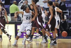 Kansas State guard Mariah White (22) celebrates her basket in the closing seconds of overtime in an NCAA college basketball game against Texas A&M in Manhattan, Kan., Wednesday, Jan. 4, 2012. Kansas State won 71-69. (AP Photo/Manhattan Mercury, Rod Mikinski)