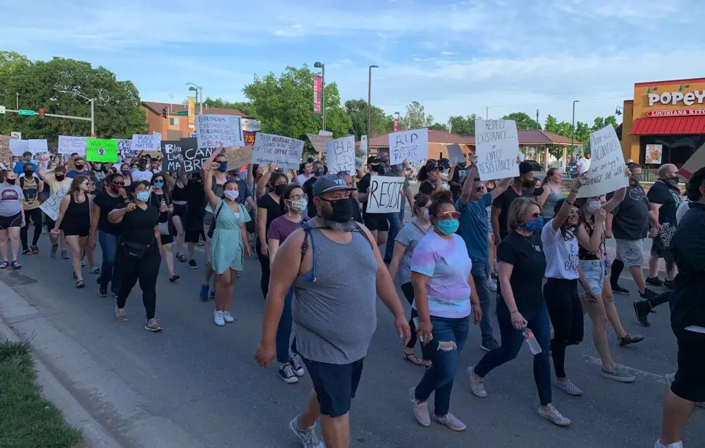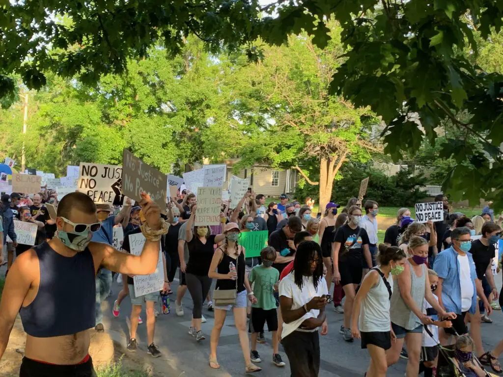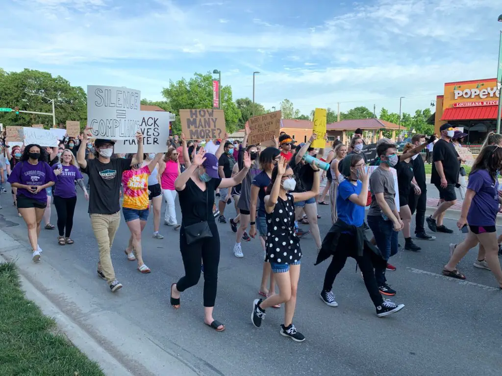 Approximately 2,000 people marched down Bluemont Ave. under police protection Tuesday evening to protest the death of George Floyd, an African American man who died last week after a white police officer knelt on his neck for nearly nine minutes.