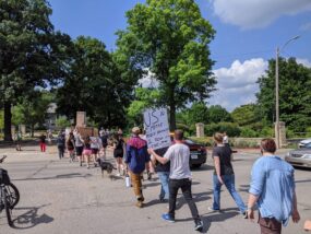 Protesters read excerpts from the Declaration of Independence, Frederick Douglass’ speech What to the Slave Is the Fourth of July? as well as a statement of solidarity from Floyd’s niece, Nire Carter. They also laid out six additional demands of the university.