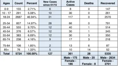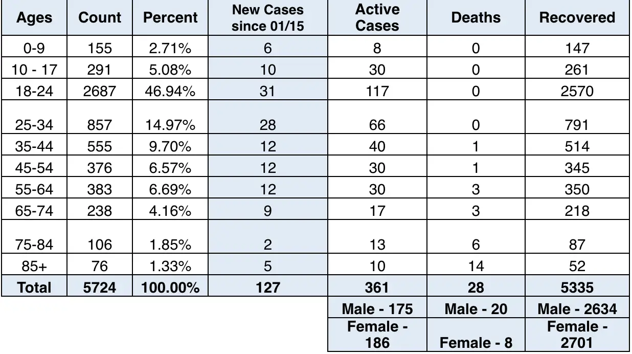 You are at:Home»Local News»Riley County confirms five new COVID related deaths, 127 new positives»RCPD chart 1-20-21