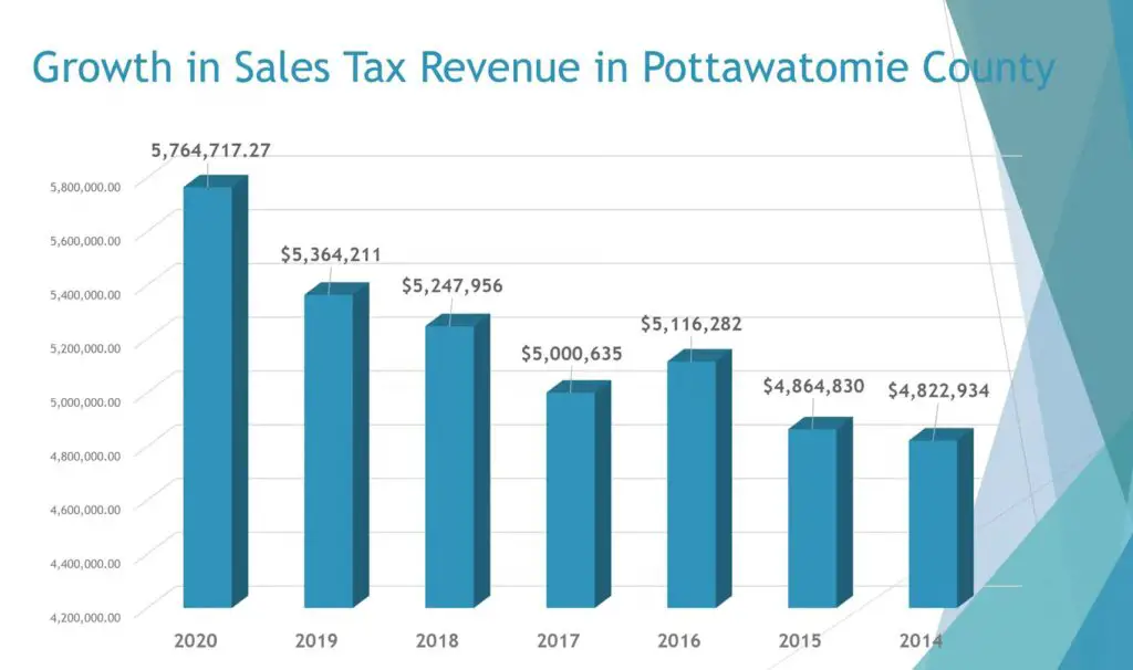 “And mostly due to the fact that some of the big boxes are in Pottawatomie County, grew from $5.3 million to $5.7 million in sales tax revenue, which is again really good for the county,” he said.