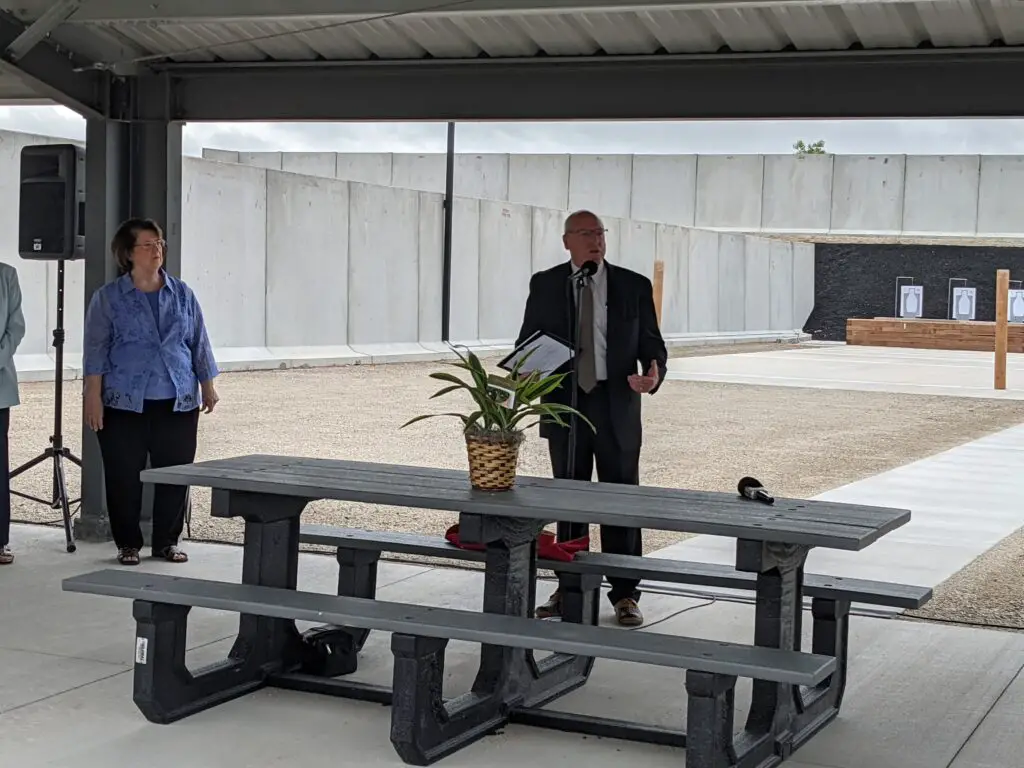Riley County Commissioner John Ford addresses attendees at the new county firearms range open house, June 30, 2021. (Photo by Troy Coverdale/KMAN News)