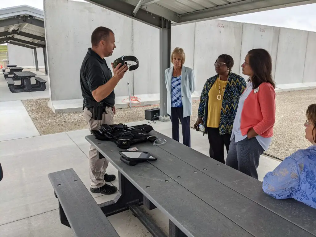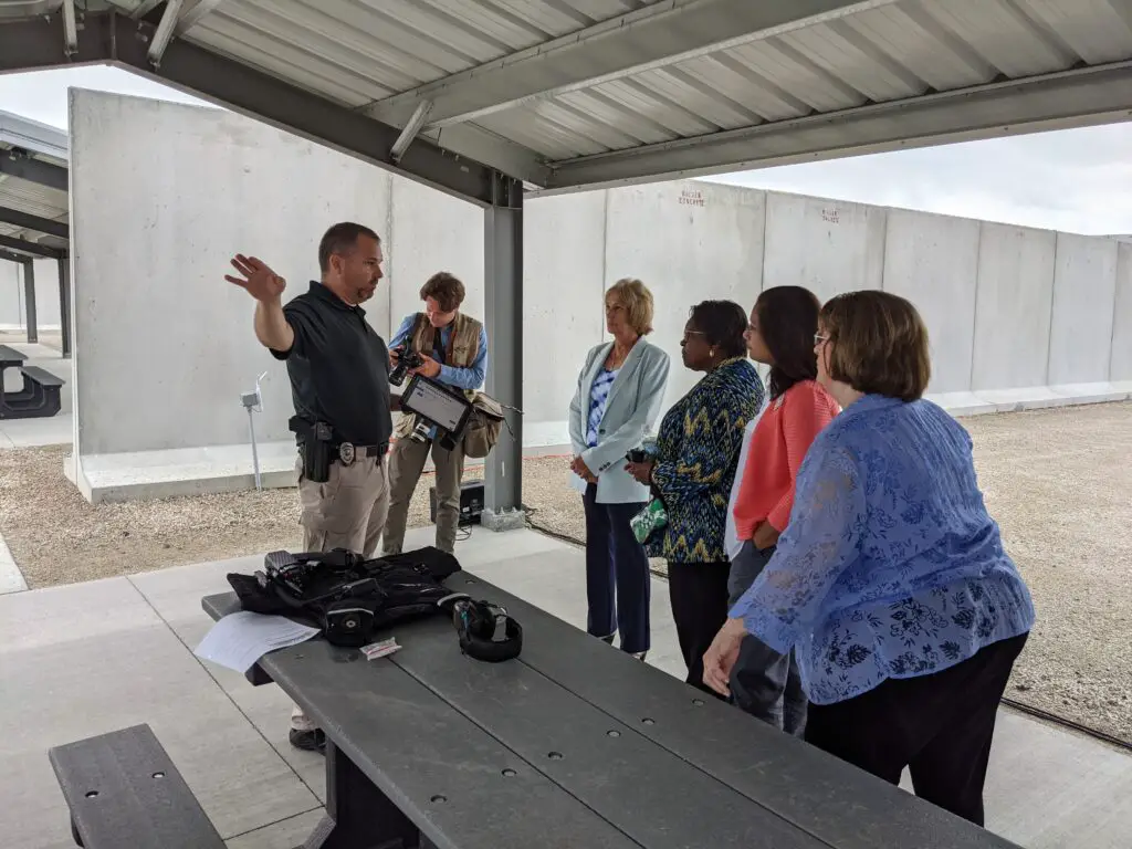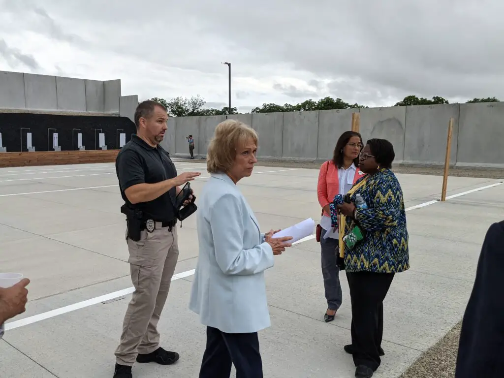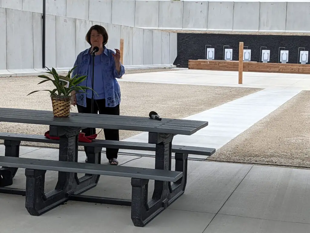 Riley County Law Board chair Linda Morse addresses those gathered for RCPD Firearms Range open house, June 30, 2021 (Photo by Troy Coverdale/KMAN News)