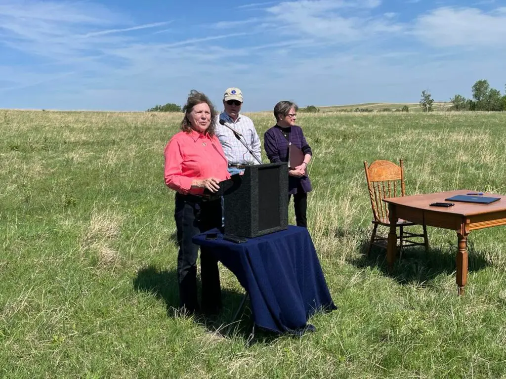 She was the first woman president of the Kansas Angus Association, and has also chaired the Kansas Beef Council and Cattlemen’s Beef Board and served as president of the Kansas Livestock Association and the National Cattlemen’s Beef Association in 2004. Lyons spoke to a gathering on her ranch a brief history of the ranch and how they and other livestock producers persuaded the federal government to not impede on their land to expand Fort Riley in the early 1980s.