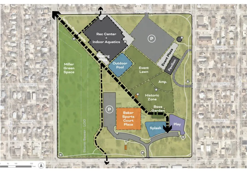 Representatives from the city’s consultant firm Vireo as well as some local architect groups, presented three design concepts for a reimagined City Park — all showing a proposed indoor aquatics center and adjacent outdoor pool on the north side of City Park along Fremont Street, near North Manhattan Avenue. The indoor facility would include a competition aquatics pool with spectator seating, a fitness center and a gymnasium, as well as community rooms and an indoor area for children.