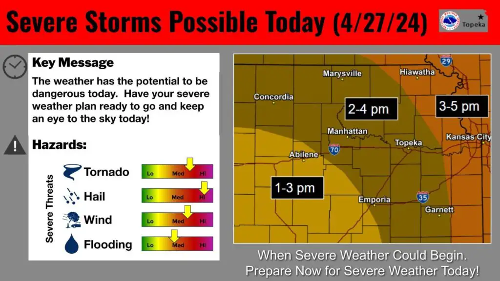 The Storm Prediction Center has placed of the eastern half of Kansas, including Manhattan, in an enhanced (level 3) risk for severe storm development throughout the afternoon and evening. Storms will be capable of producing very large hail over two inches in diameter, damaging winds around 70 mph and dangerous tornadoes.