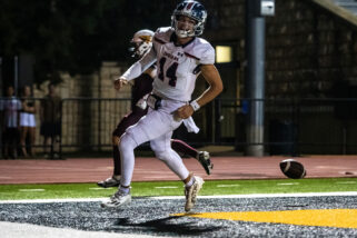 Manhattan High quarterback Carter Aslin scores on a 40-yard touchdown in the third quarter against Hays during their game Sept. 20 at Lewis Field Stadium in Hays. Aslin tallied over 1,500 passing and rushing yards with 42 total TDs this season.