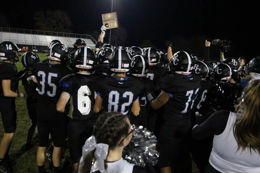 Rock Creek players hoist their regional championship plaque in the air following a 21-11 win over Hesston during the 2022 season. The undefeated Mustangs will host Cheney on Friday. Photo courtesy of Mindy Vinduska