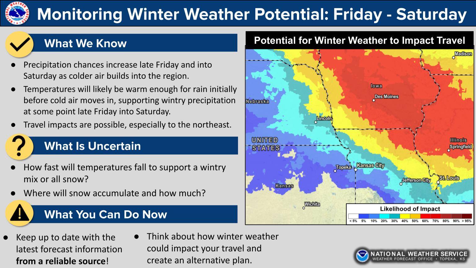 Forecasters continue to monitor a late-week weather system that could bring rain and snow to parts of northeast Kansas from Friday into Saturday, though the highest impacts are currently projected farther northeast.