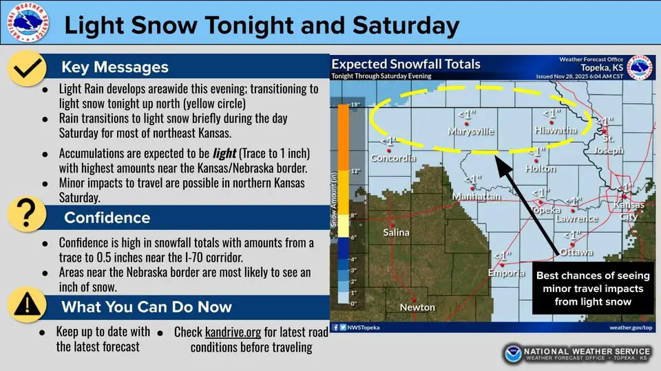 Light rain is expected to develop across northeast Kansas Friday evening before transitioning to light snow from north to south through Saturday, according to forecasters.