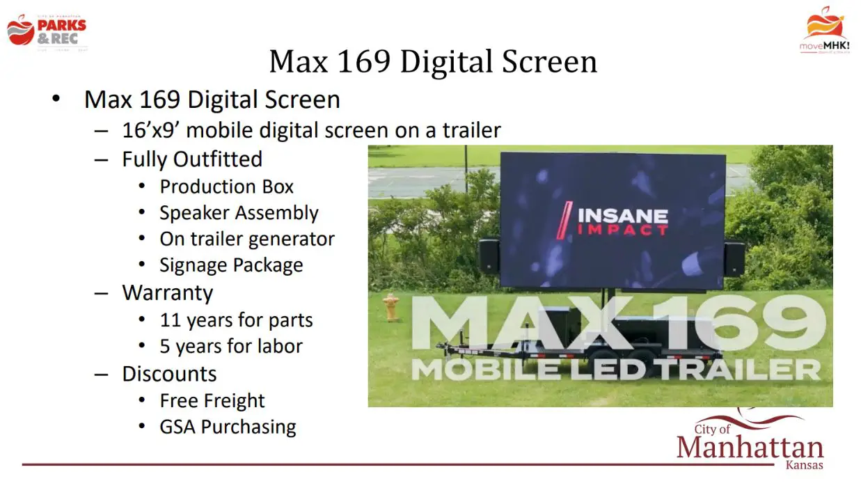 City commissioners on Tuesday permitted parks and recreation to purchase additional robotic mowers, portable pitching mounds and a mobile digital screen.