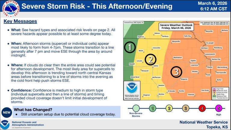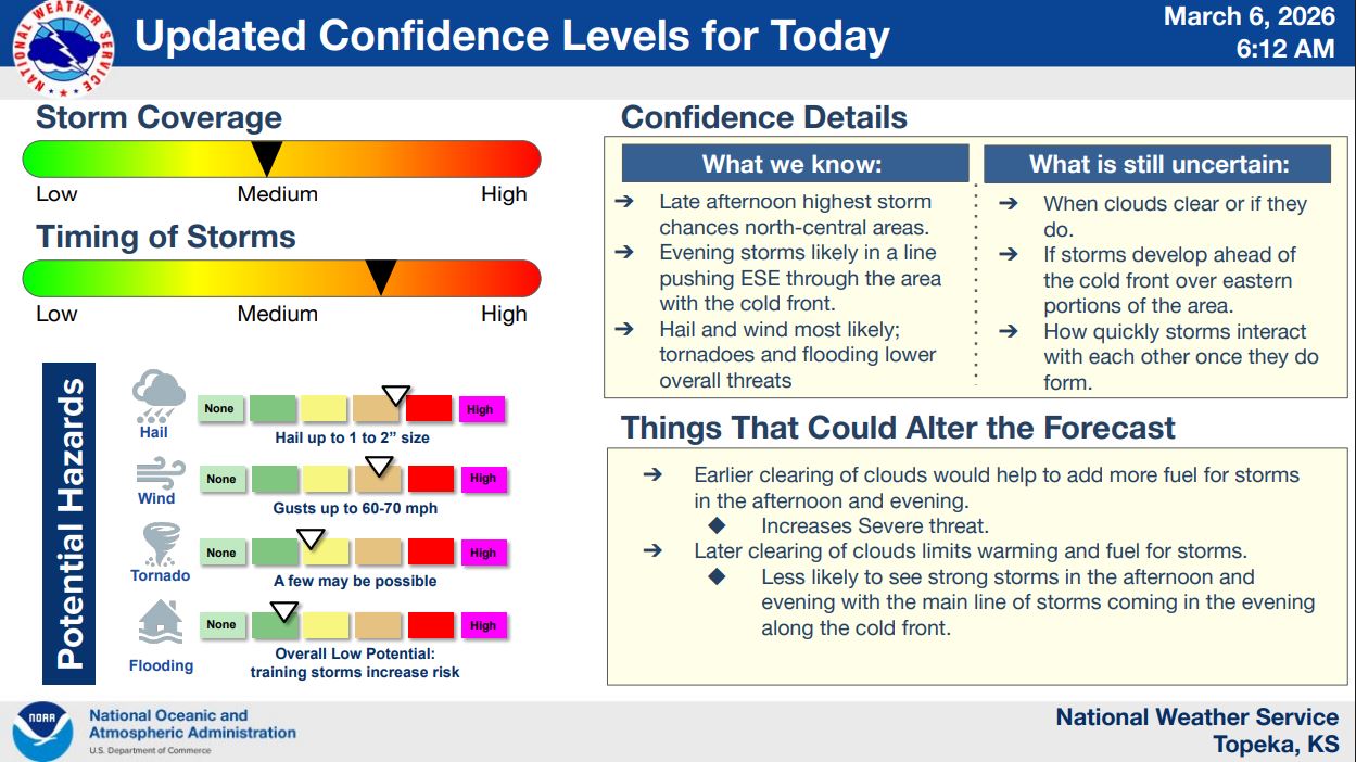 The entire region could see storms if cloud cover clears enough to allow additional warming during the day. Meteorologists say the most likely area for early supercell development is trending toward north-central Kansas before storms organize into a larger system as a cold front pushes through.