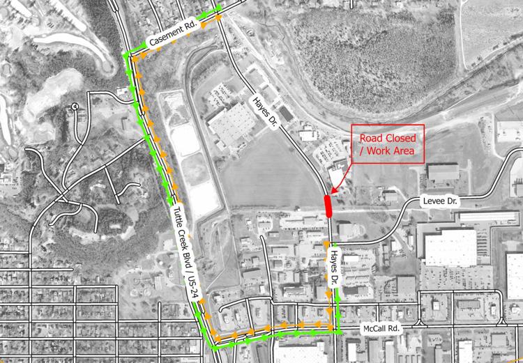 During this time, Hayes Drive will be closed in a section north of the intersection with Levee Drive. Traffic will be detoured via Tuttle Creek Boulevard to Casement Road and McCall Road to access Hayes Drive around the closure.