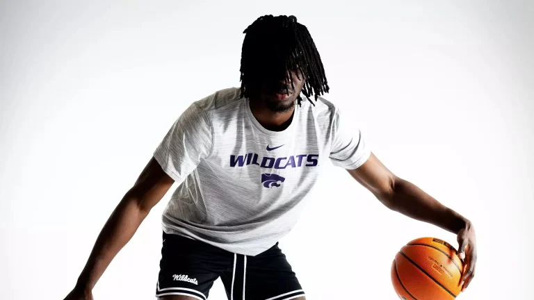 Stephen Osei dribbles during a recruiting visit to Kansas State. The sophomore forward intends to enter the transfer portal after redshirting the 2025-26 season. Photo courtesy of K-State Athletics