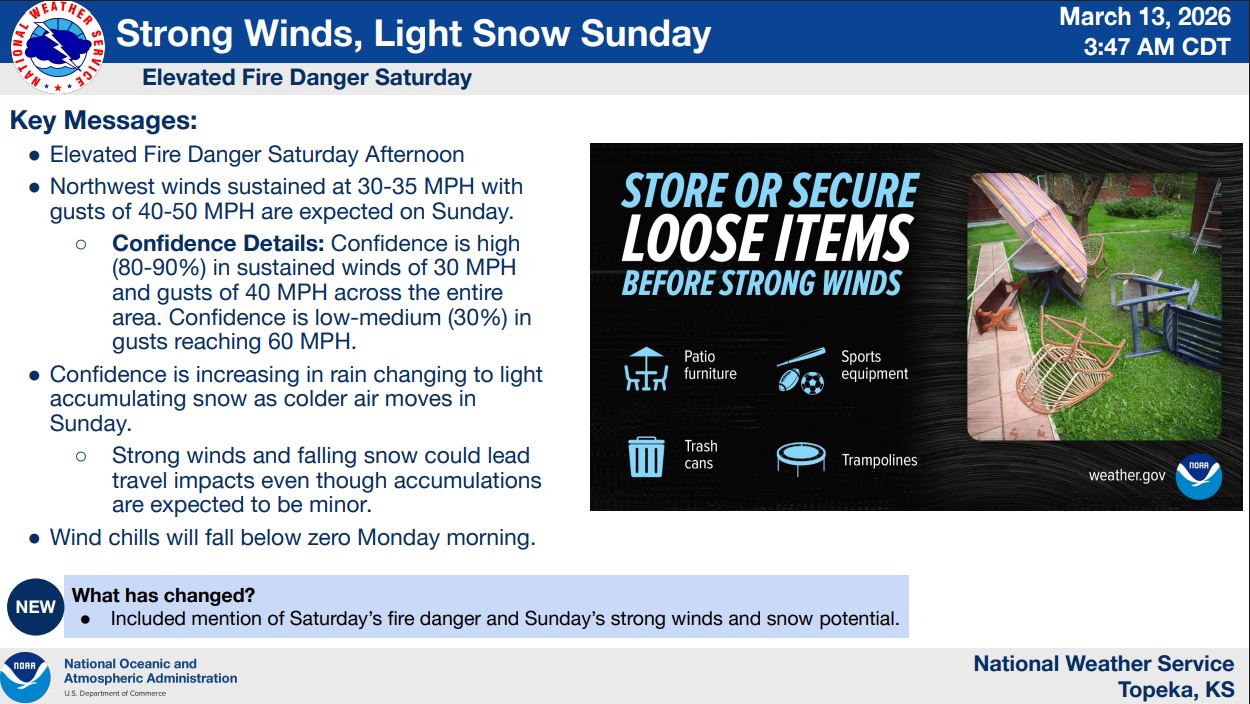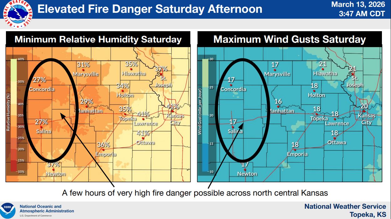 Saturday afternoon brings an elevated fire danger, particularly across north-central Kansas, as dry air and breezy conditions combine to create conditions favorable for fire spread. Forecasters say relative humidity levels could fall into the 25–35% range, increasing the risk for rapidly spreading fires during the afternoon hours.