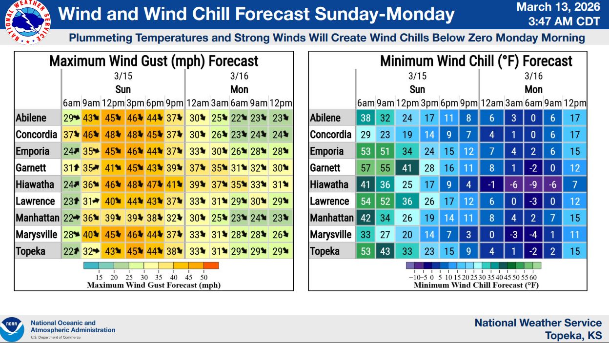 Weather conditions will change quickly on Sunday as a cold front moves through the region. Meteorologists expect northwest winds sustained at 30 to 35 mph with gusts of 40 to 50 mph, with a smaller chance of gusts approaching 60 mph. The strong winds could blow around unsecured outdoor items and make travel difficult at times.