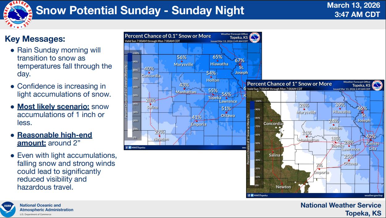 Rain is expected to develop Sunday morning before transitioning to light accumulating snow as colder air moves into the region during the day. Forecasters say the most likely scenario is less than 1 inch of snow, though isolated areas could see up to around 2 inches.