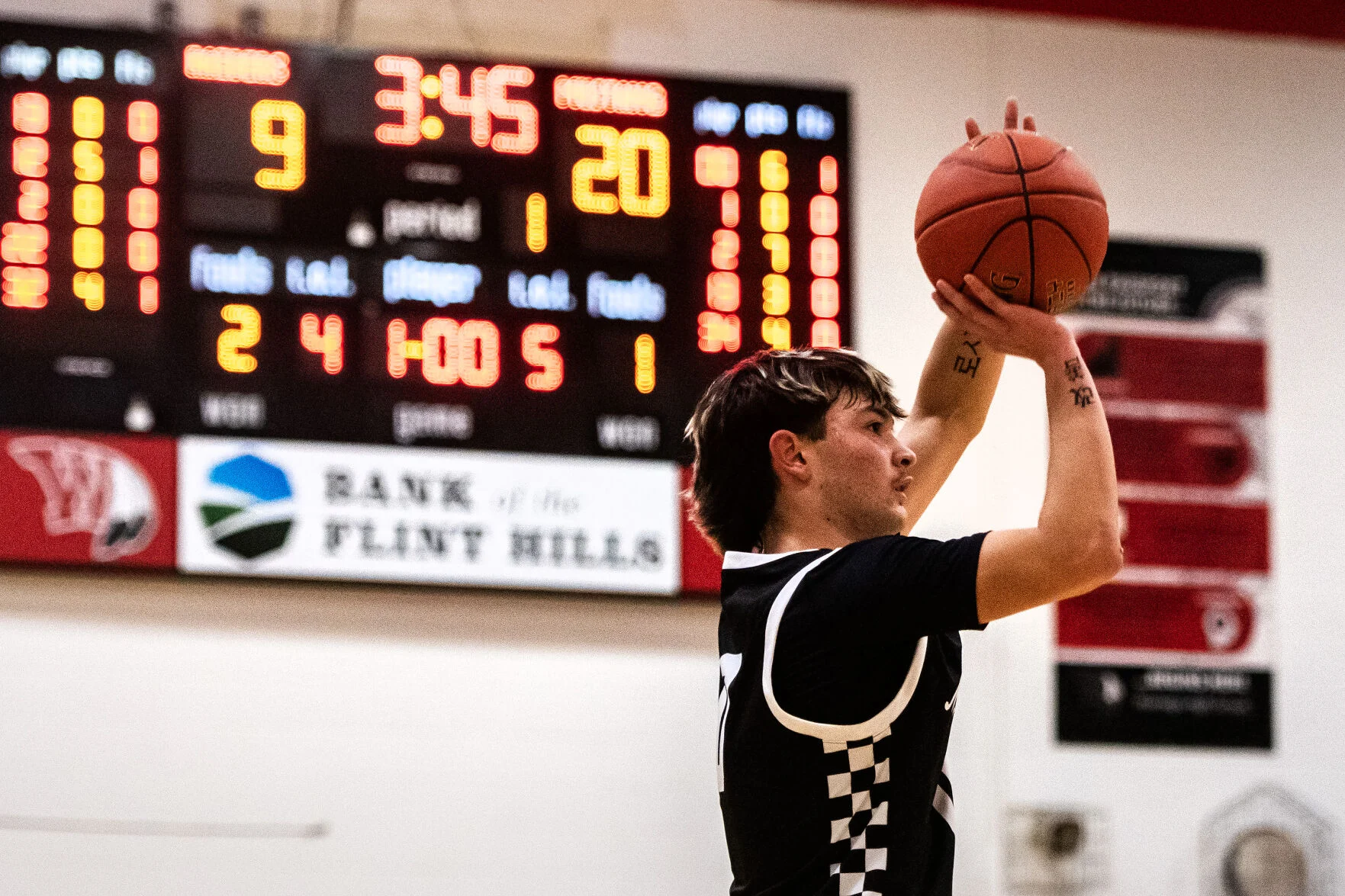 Rock Creek’s Gavin Rosa shoots for three in a Jan. 30 game at Wamego. Rosa shot 48 percent from beyond the arc, knocking down 112 3-pointers. Staff photos by Lewis Marien