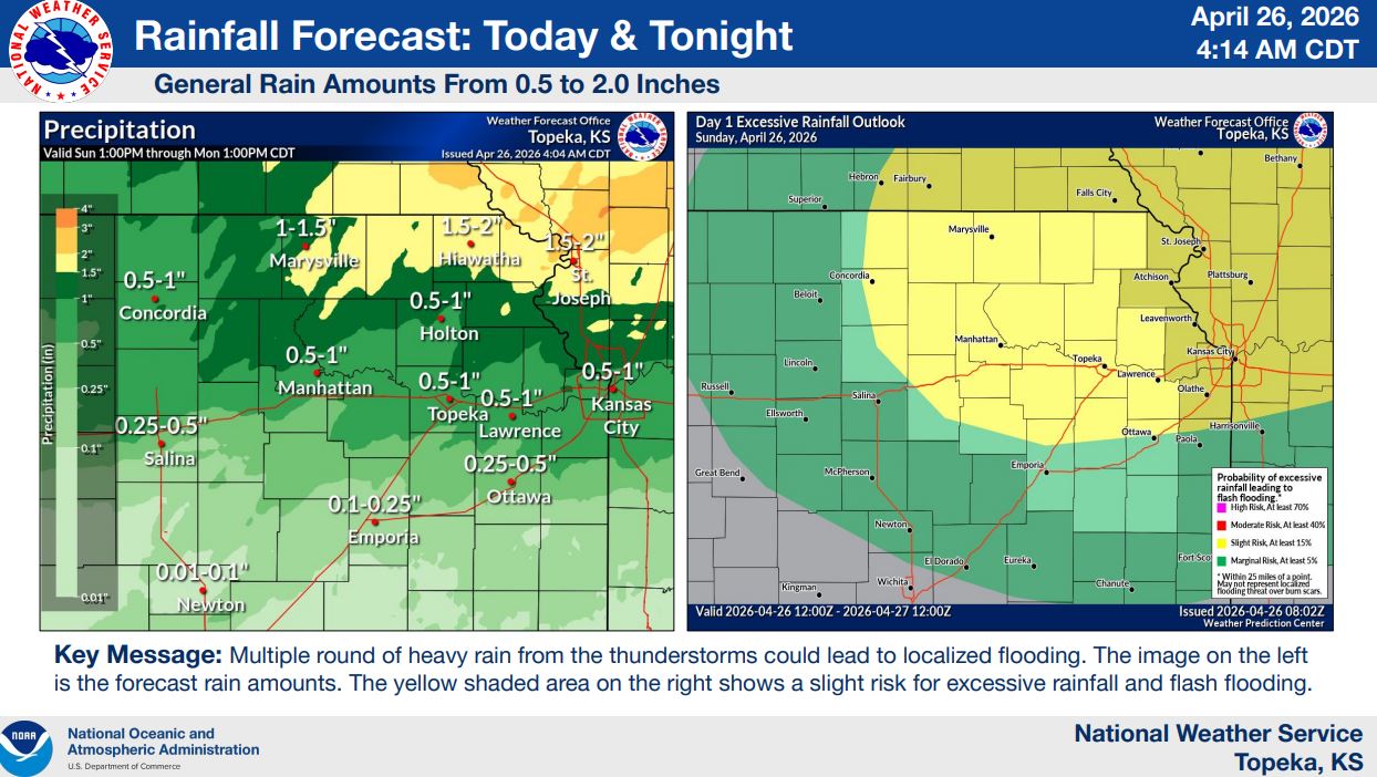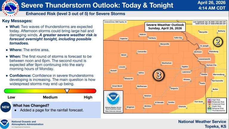 Severe thunderstorms are expected to impact the region in two waves today and into early Monday, with the National Weather Service placing much of northeast Kansas under an enhanced risk for severe weather.