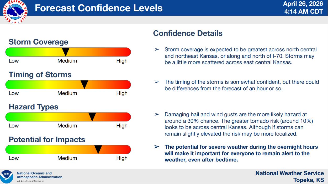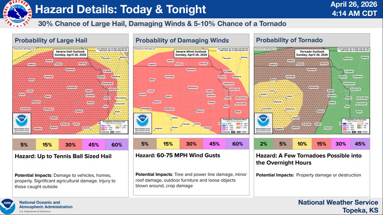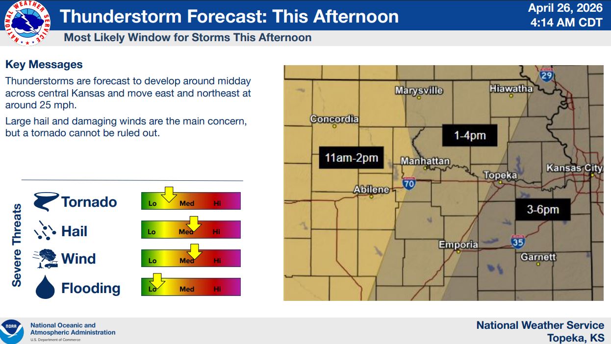 Forecasters say the first round of storms is expected between noon and 6 p.m., with activity developing across central Kansas and moving east and northeast at around 25 mph. These afternoon storms could produce large hail and damaging wind gusts, though a tornado cannot be ruled out.