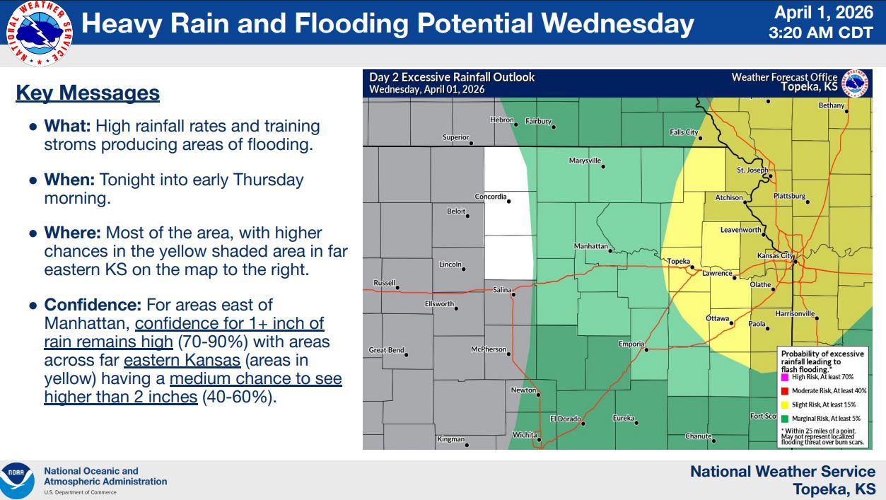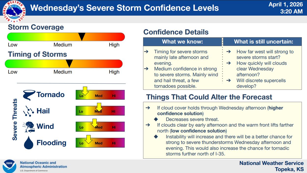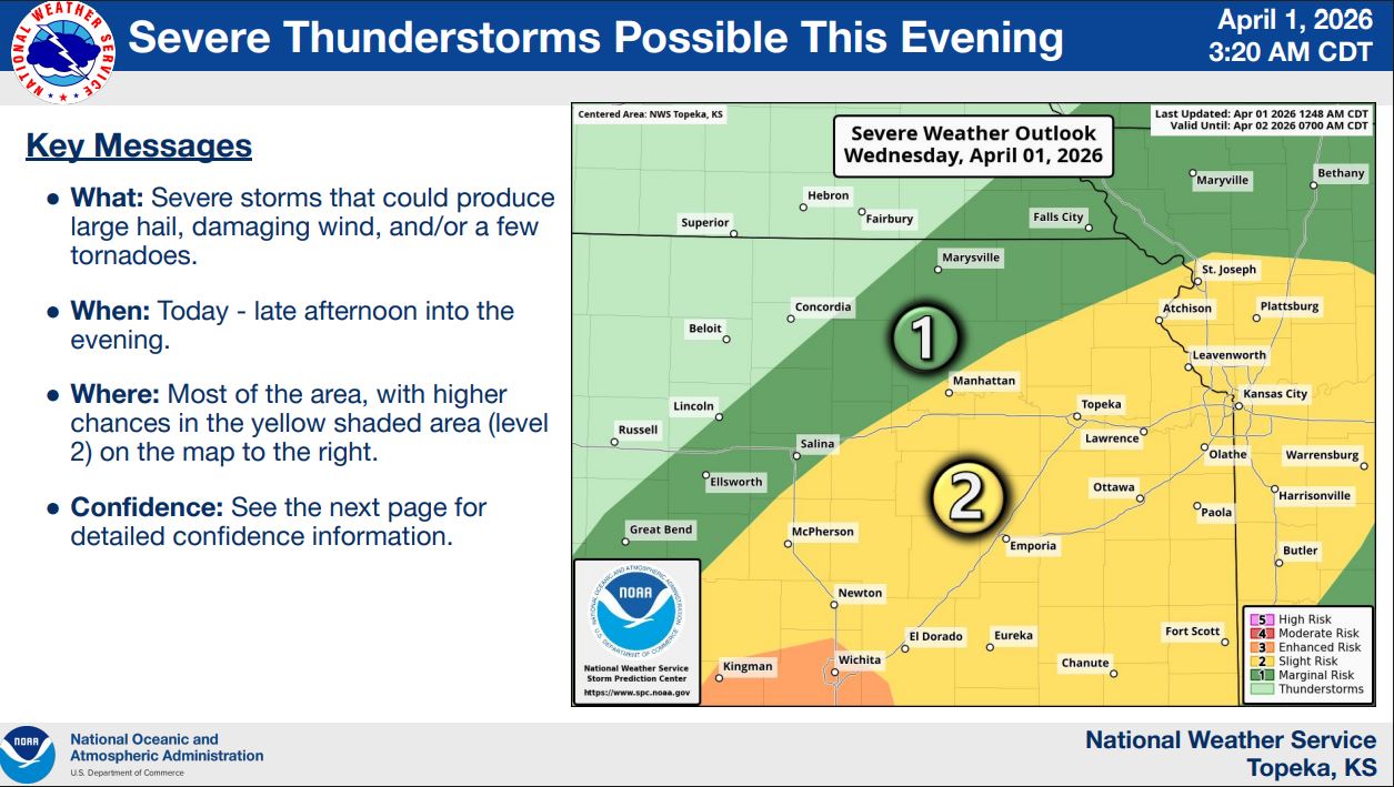Strong to severe thunderstorms are expected to develop across northeast Kansas later today, with the primary threats including large hail, damaging winds and the potential for a few tornadoes, according to the National Weather Service.