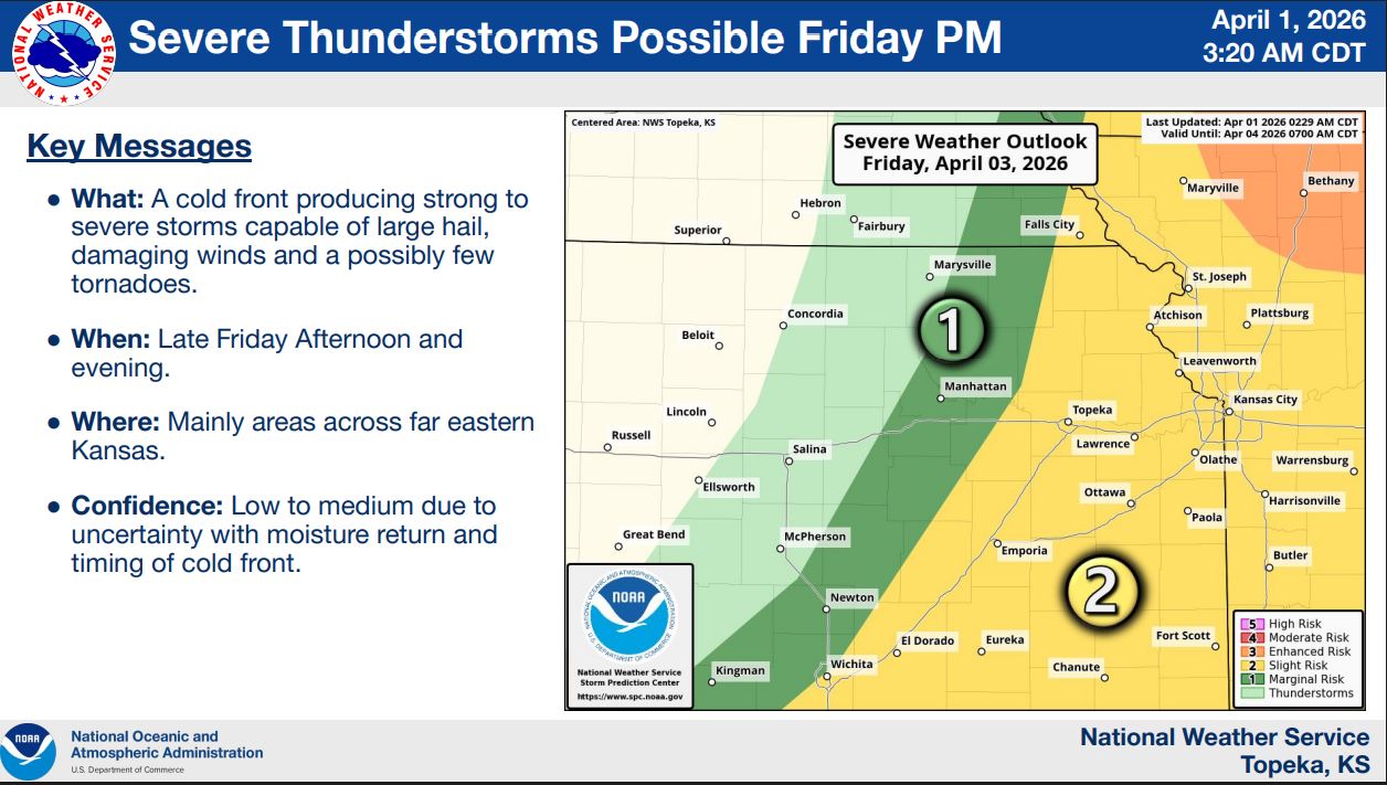 Another round of strong to severe storms is possible Friday afternoon and evening, though confidence in that system remains lower due to uncertainty in timing and available moisture.