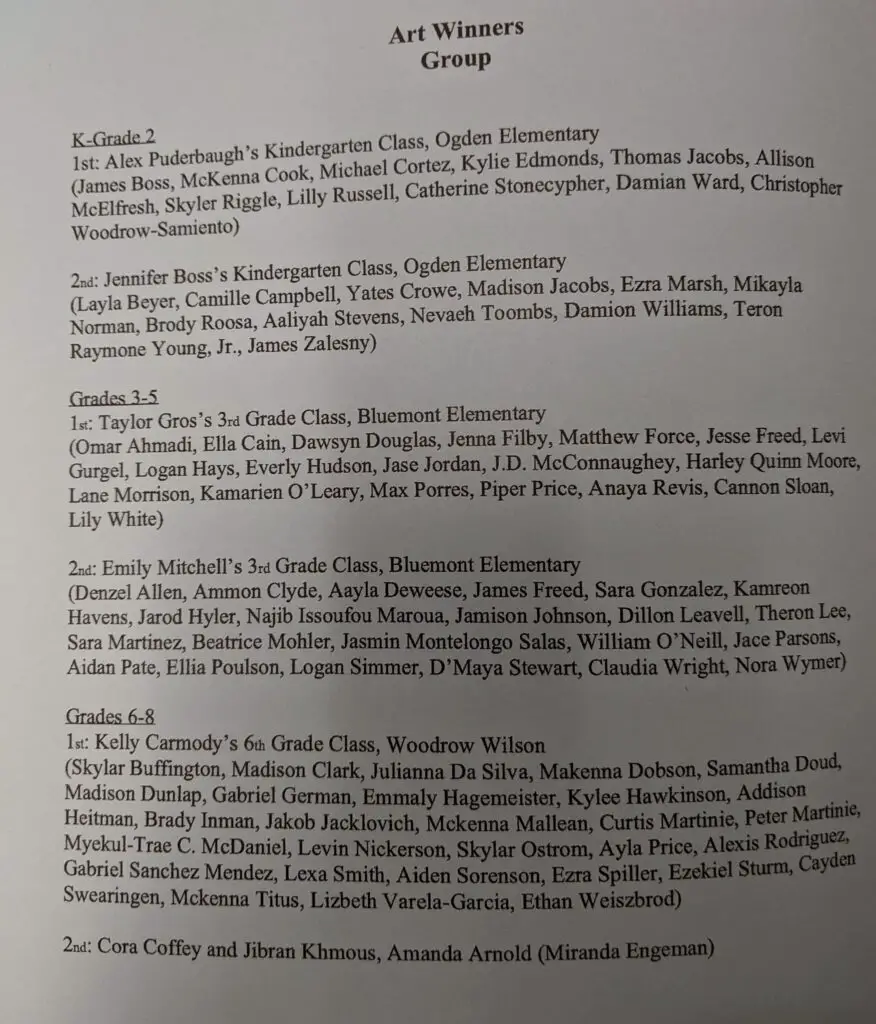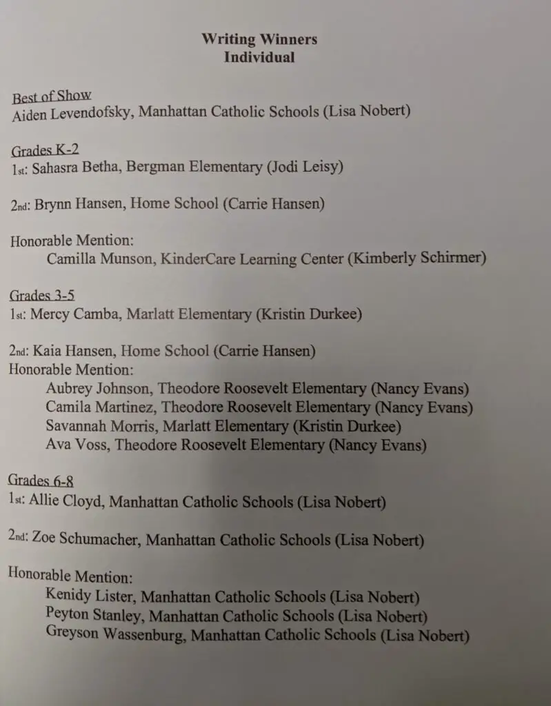 His words echoed the theme of the art and writing contest: “Life’s most important and urgent question is, ‘What are you doing for others?'” Winners are listed below: