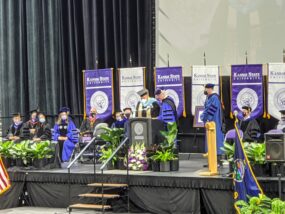 A man integral to revitalizing the written form of the Indigenous Osage language received his honorary doctorate Friday at Kansas State University’s Graduate School Commencement Ceremony, delivering his remarks as the ceremony’s speaker in Osage as well.