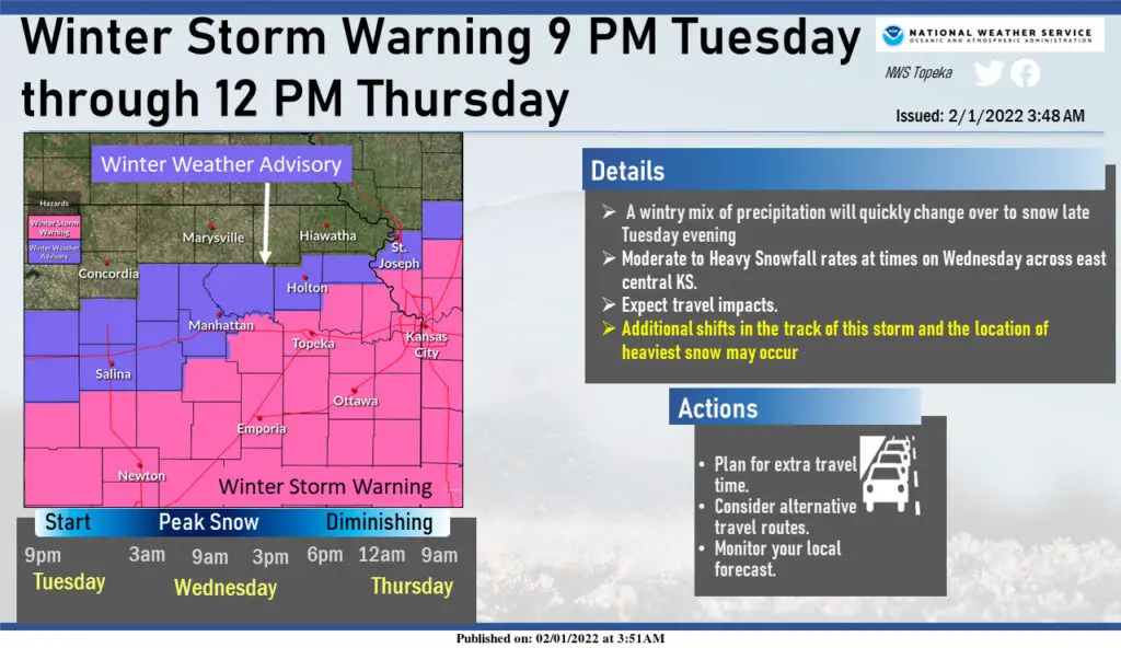 A Winter Storm Warning is posted for the same time frame from southwest Kansas to the Kansas City metro, including Topeka and Lawrence.