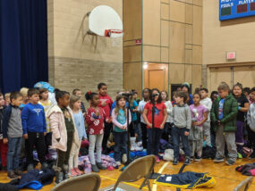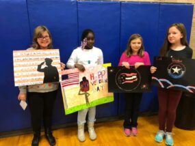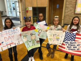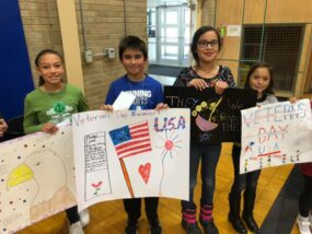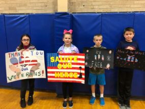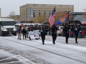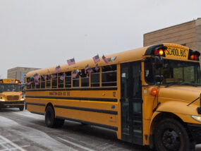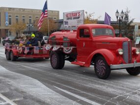 Students from Manhattan-Ogden and Junction City Schools paraded in buses due to the cold. They held red and blue posters thanking veterans for their service. Several others paraded including firetrucks, motorcyclists and others along Poyntz Ave. from Manhattan Town Center to City Hall.